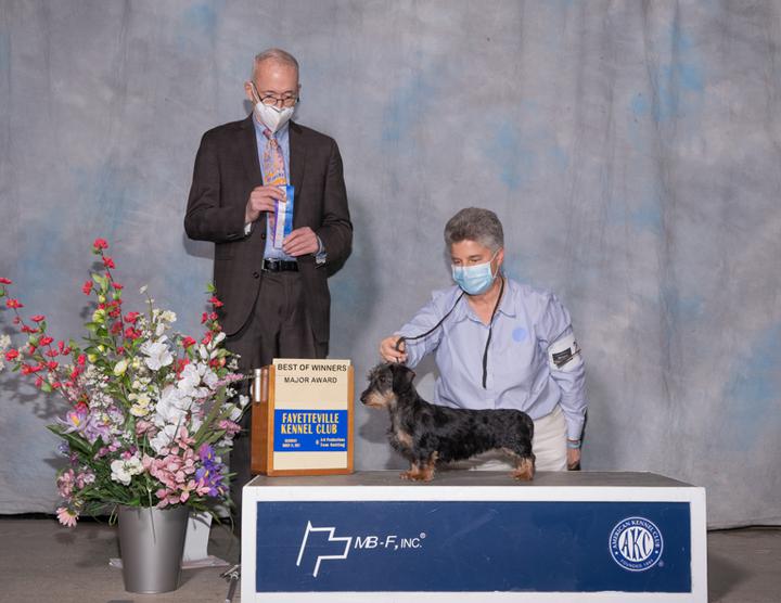 Emmaline is the cutest black and tan miniature wirehaired dachshund ever. She started her show career at the Tarheel circuit in March 2021 and was awarded winner's bitch and Best of Winners on the last day for a 5 point major. Look for Emma and her littermate Monty at other shows in 2021. Emma was also awarded 2 first place ribbons at the Churchville Community dog show with my grandchildren as her handlers.