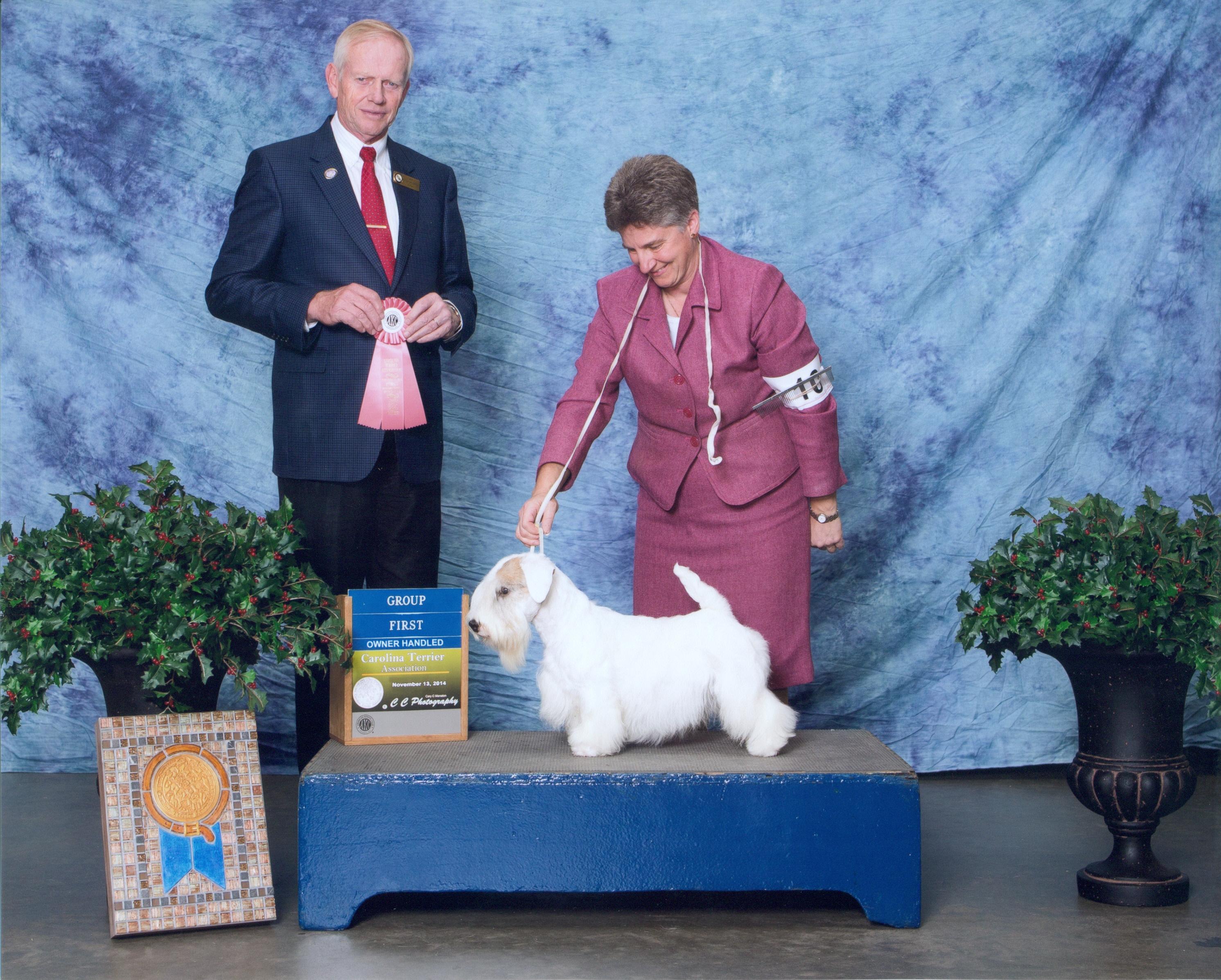Sophia finished her Grand Championship in November 2014 at the North Carolina Terrier Association where she also won the Owner Handled Terrier Group under judge Gier Flyct-Pederson. Sophia was bred by Margery Good and France Bergeron and brought an infusion of excitement and new genetics to Rosemont. Sophia is out of Valley, the Sealyham terrier who was Best In Show at the 2011 Montgomery County Kennel Club show, and sired by Italian import Luc. Sophia produced 3 litters of puppies including 6 AKC conformation champions (so far) and 3 AKC agility champions and was inducted into the ASTC Registry of Merit in 2019. Sophia is now retired and lives with her best friend Midge.